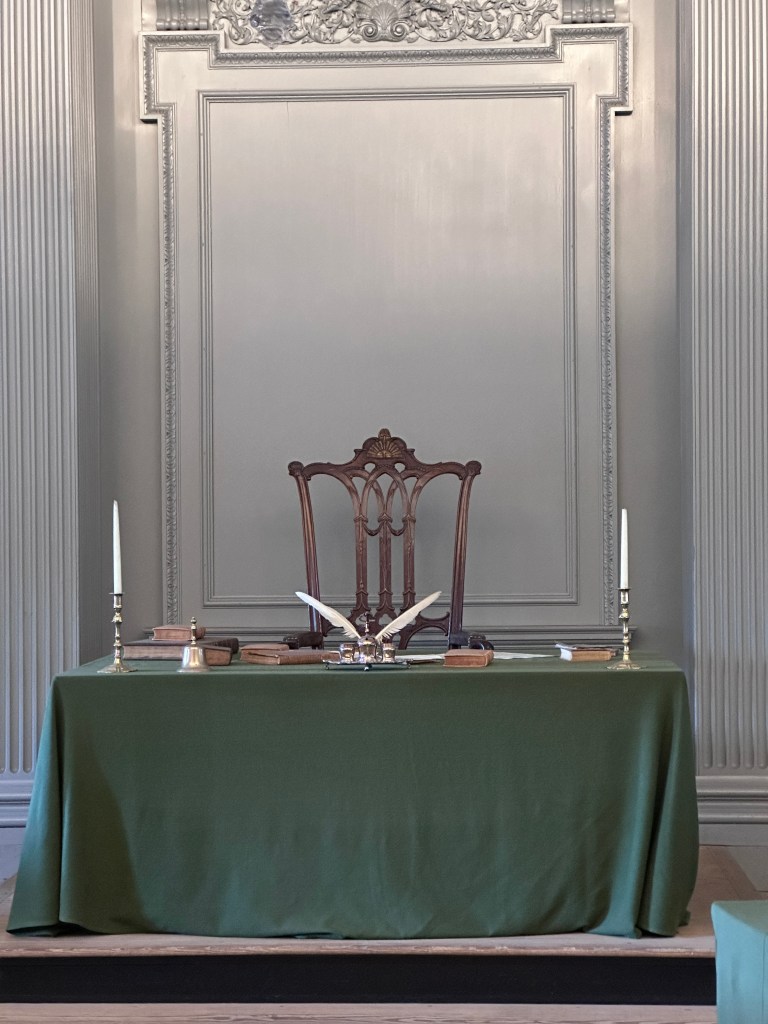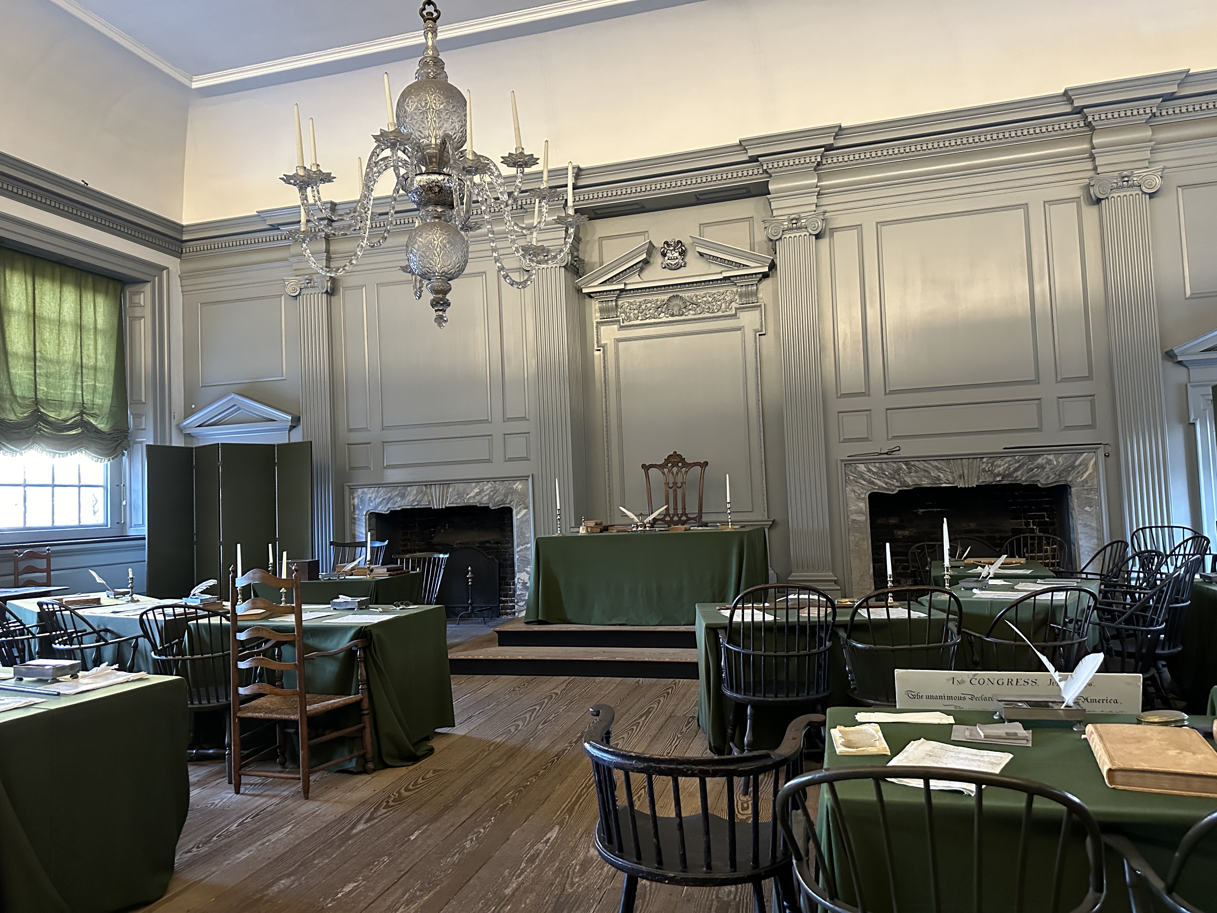 The chair in the center called the Rising Sun Armchair is where George Washington sat down during the months when the constitution was made.
